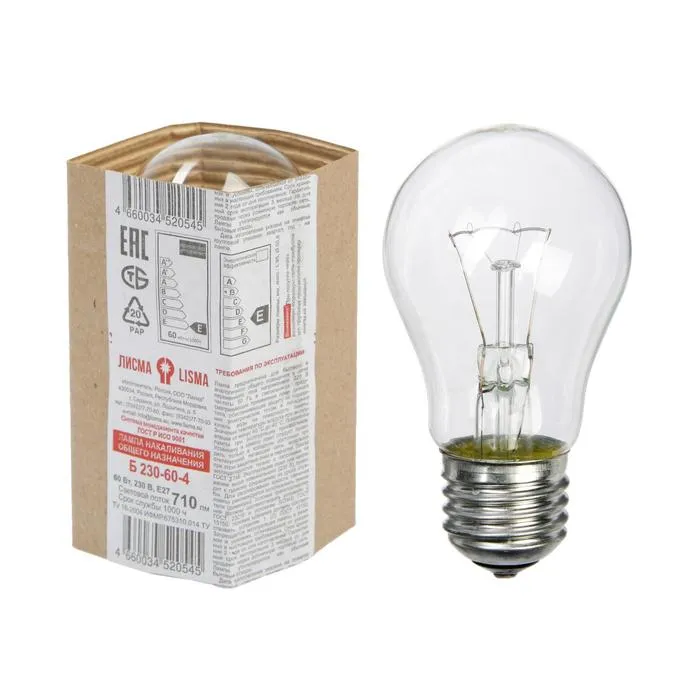 Лампа накаливания «Лисма», Б, Е27, 60 Вт, 230 В