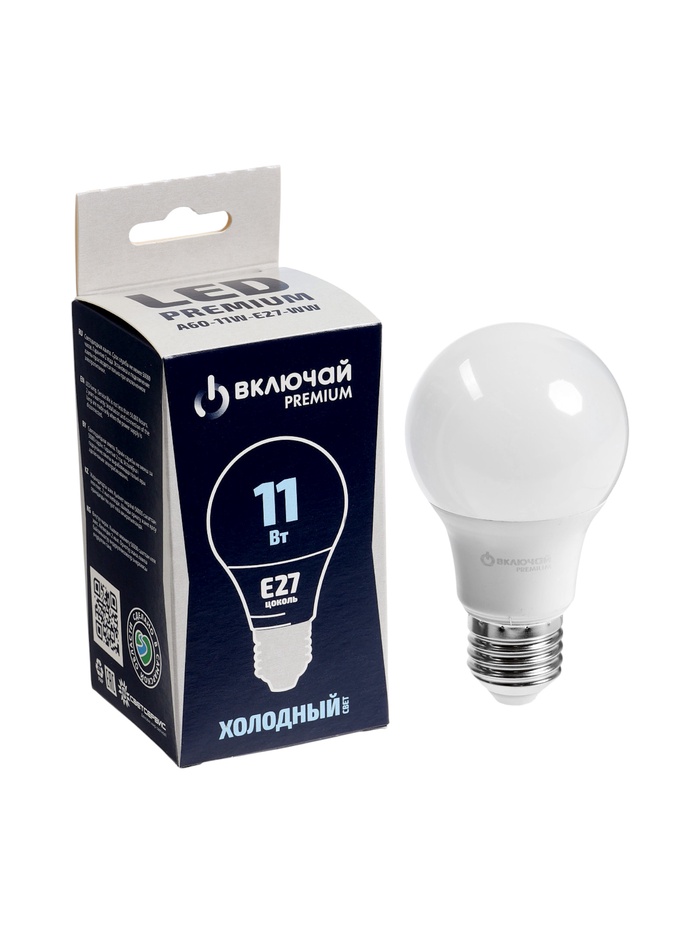 Лампа светодиодная Включай, А60, 11 Вт, E27, 1045 лм, 6500K, IP20, свечение холодное белое