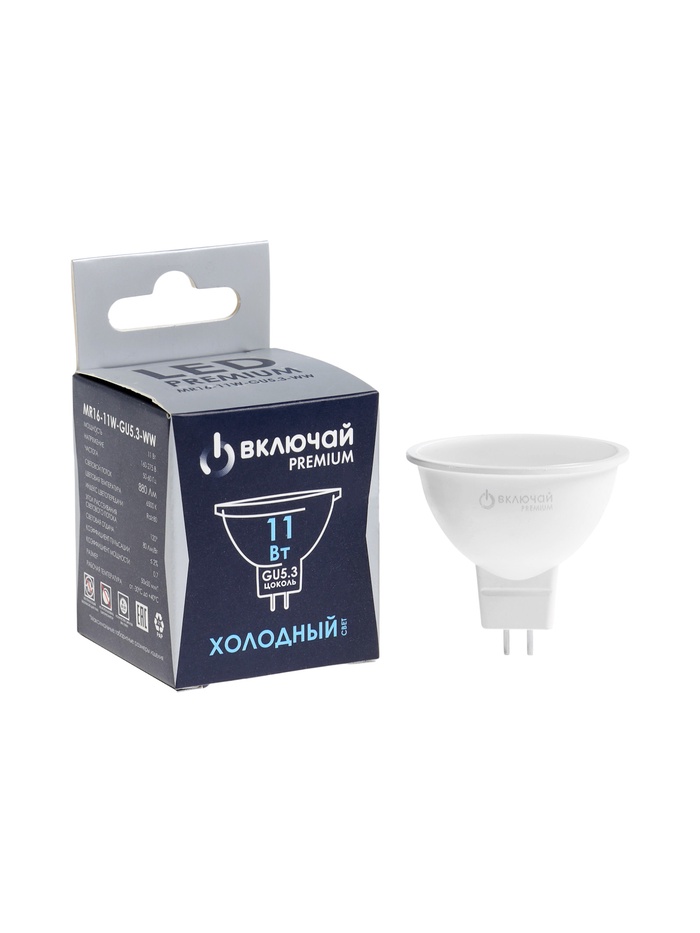 Лампа светодиодная Включай, MR16, 11 Вт, GU5.3, 880 лм, 6500K, IP20, свечение холодное белое