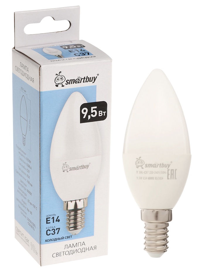 Лампа светодиодная Smartbuy, Е14, C37, 9.5 Вт, 6000 К, холодный белый свет