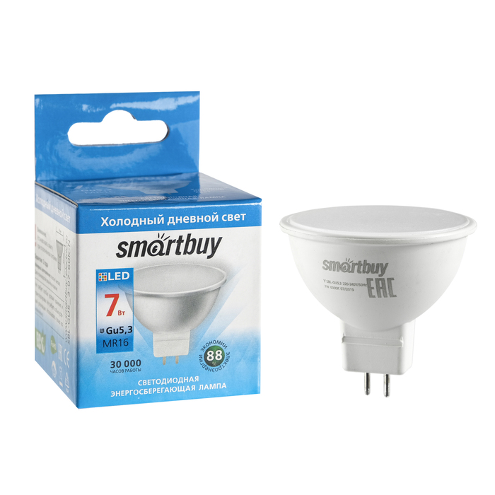 Лампа светодиодная Smartbuy, GU5.3, 7 Вт, 6000 К, свечение холодное белое