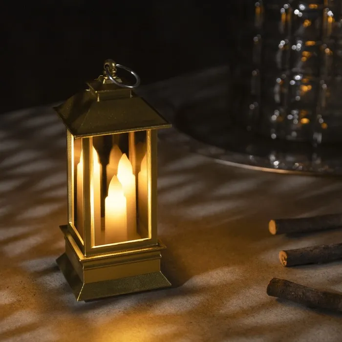 Светодиодная фигура «Золотистый фонарь со свечками» 5.5 × 13 × 5.5 см, пластик, батарейки AG13х3 (в комплекте), свечение тёплое белое