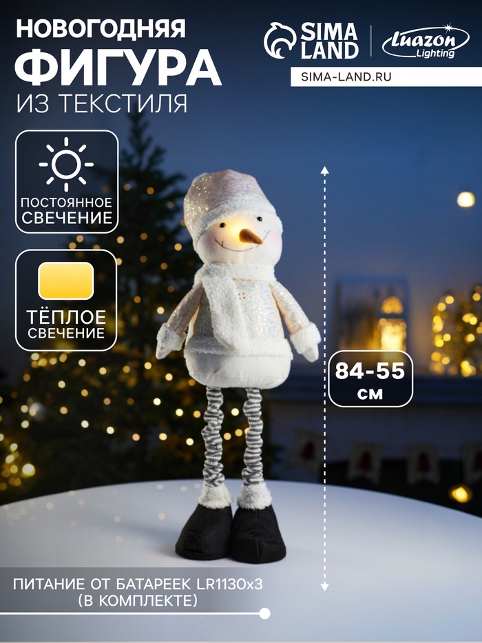 Светодиодная фигура «Снеговик» 55-84 см, текстиль, телескопические ножки, 1 LED, от батареек LR1130×3, свечение тёплое белое