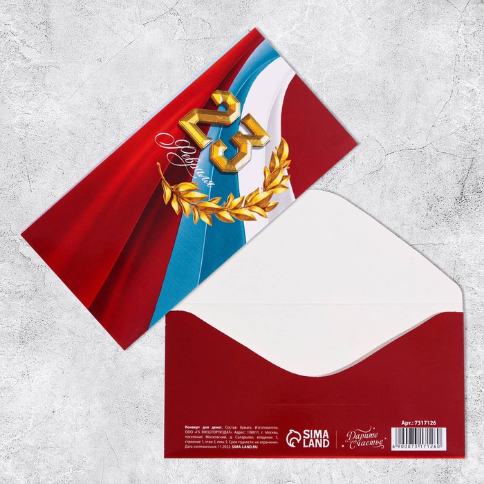 Удобный формат конвертов позволяет вложить любую сумму, а также сопроводить её поздравительной запиской. Конверты изготовлены из качественных материалов, что обеспечивает их презентабельный внешний вид. Подчеркните свое внимание к деталям и уважение к получателю, выбрав подходящий конверт для денежного подарка на 23 Февраля.