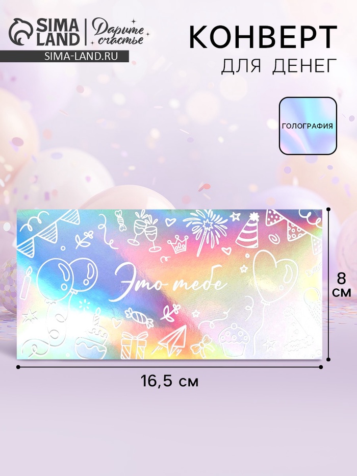 Конверт для денег «Это тебе», голография, торт и шары, 16.5×8 см