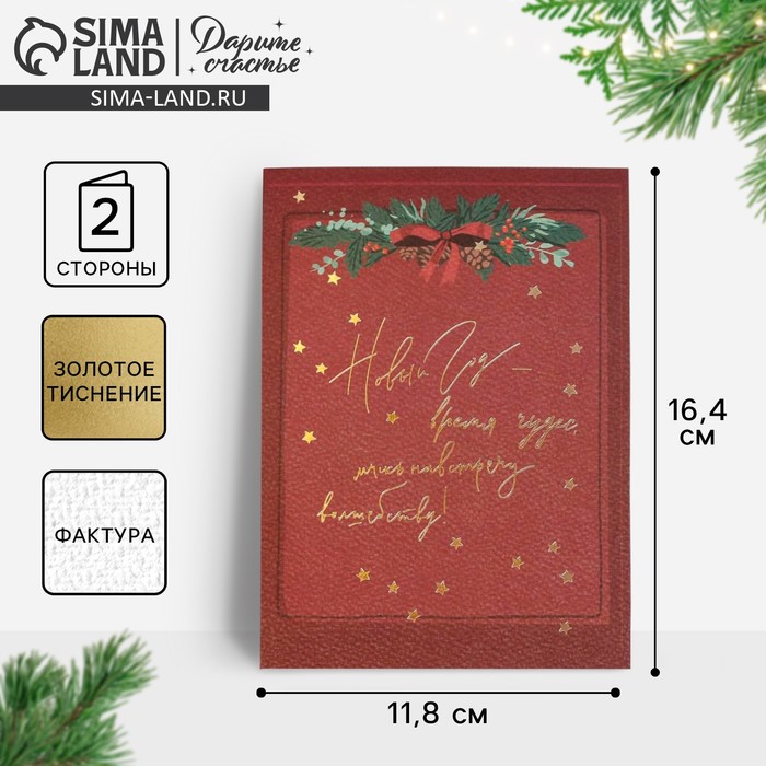 Открытка с новым годом на акварельном картоне «Время волшебства», тиснение, 11,8 х 16,4 см