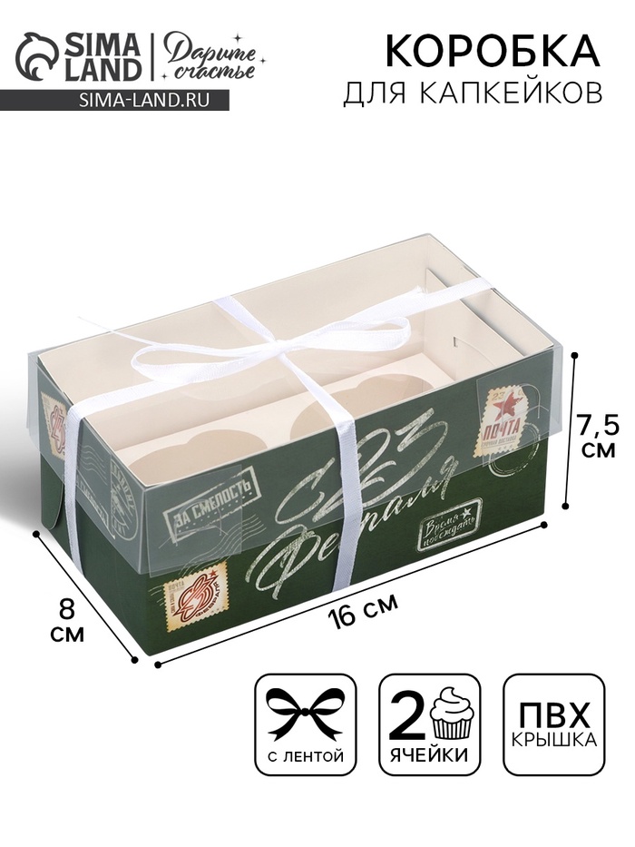 Коробка для капкейка, кондитерская упаковка, 2 ячейки, «23 февраля», 16 х 8 х 7.5 см