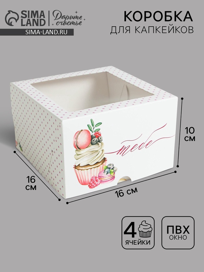 Коробка для капкейков, кондитерская упаковка, 4 ячейки «Тебе» 16 х 16 х 10 см