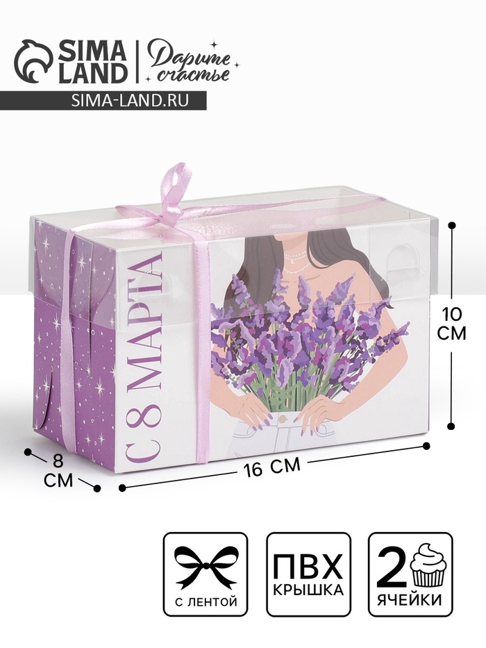 Коробка для капкейков, кондитерская упаковка с пластиковой крышкой, 2 ячейки, «8 марта», 16 х 8 х 10 см