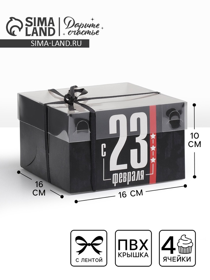Коробка для капкейков, кондитерская упаковка с пластиковой крышкой, 4 ячейки «23 февраля», 16 х 16 х 10 см