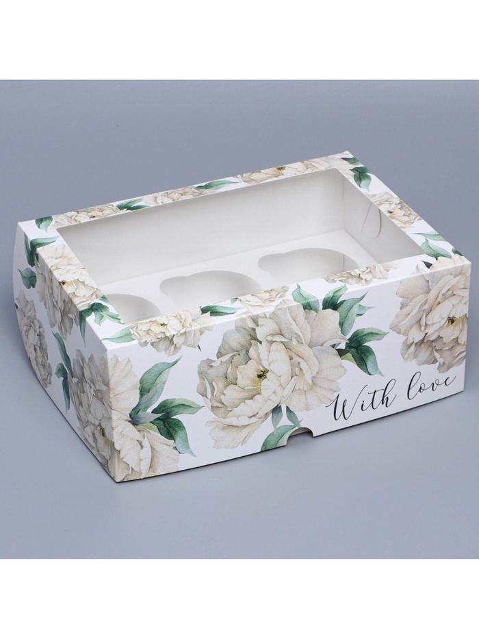 Коробка для капкейков, кондитерская упаковка с окном, 6 ячеек, «Белые пионы», 25 х 17 х 10 см