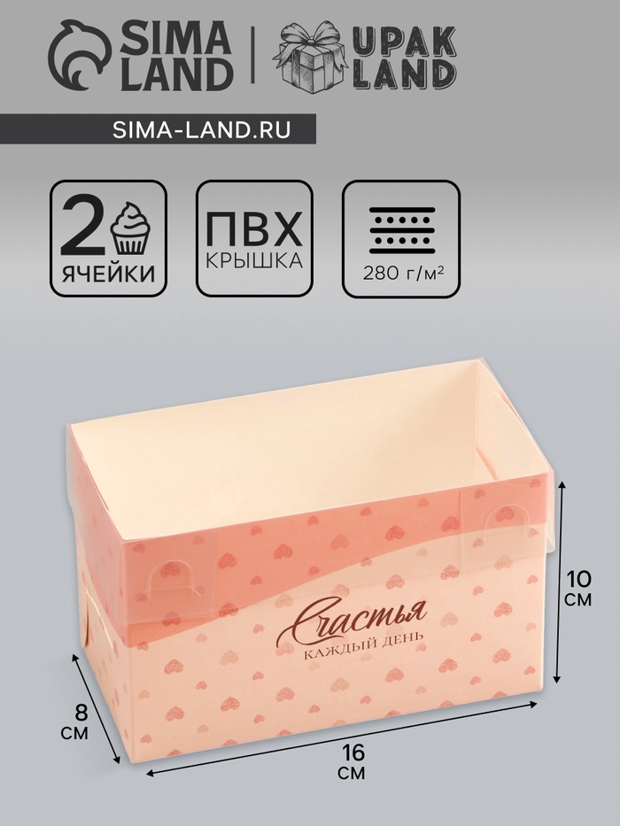 Коробка для 2 капкейка с прозрачной крышкой, «Счастливых моментов», 16×8×10 см