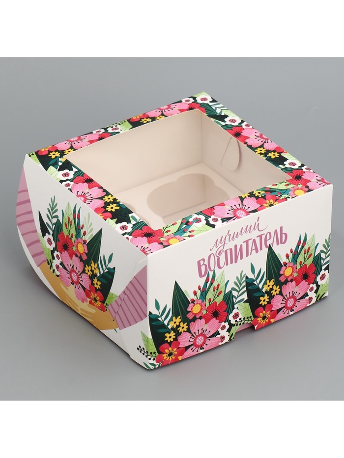 Коробка для капкейков, кондитерская упаковка с окном, 4 ячейки «Лучший воспитатель», 16 х 16 х 10 см