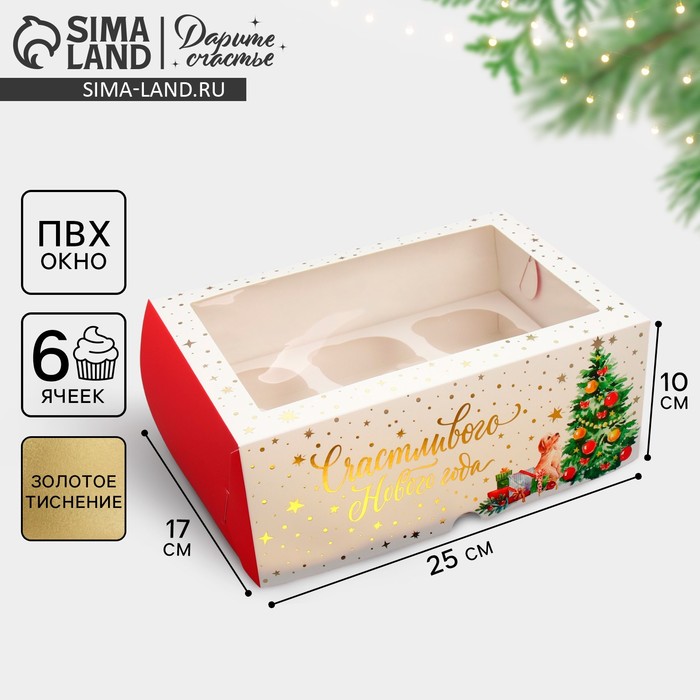 Коробка складная на 6 капкейков с окном «Счастливого Нового года», 25 х 17 х 10 см