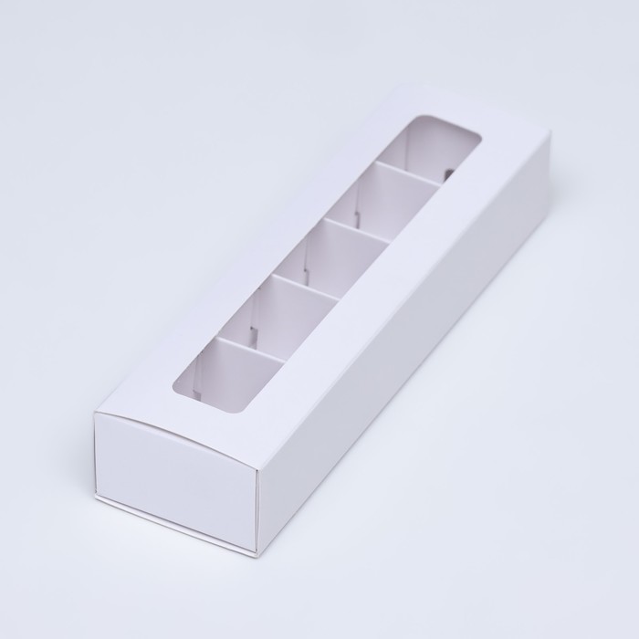 Коробка под 5 конфет с обечайкой, с окном, с тонкими разделителями, белый 21×5×3.3 см
