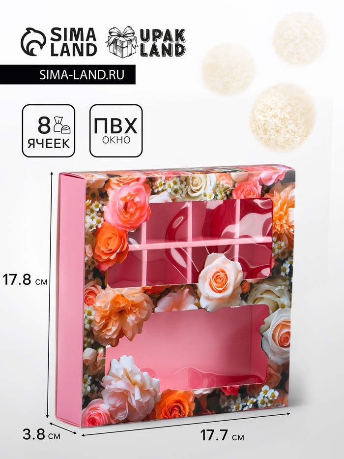 Коробка для 8 конфет шоколад, с окном, «Цветочки» 17.7×17.8×3.8 см
