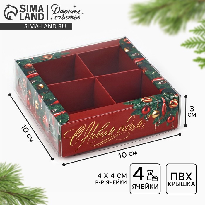 Коробка под 4 конфеты с ячейками «Новогодние украшения», 10 х 10 х 3 см