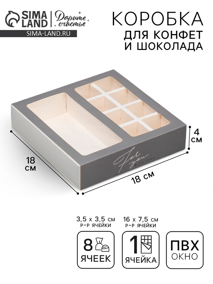 Коробка под 8 конфет и шоколад с ячейками, кондитерская упаковка, For you 18 х 18 х 4 см