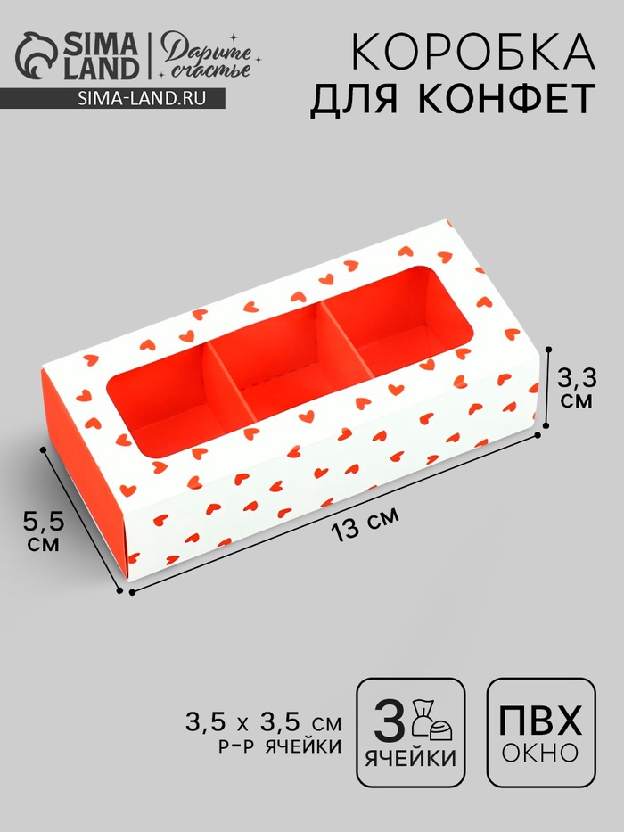 Коробка под 3 конфеты с ячейками «Сердечки», 13 х 3 х 5.5 см