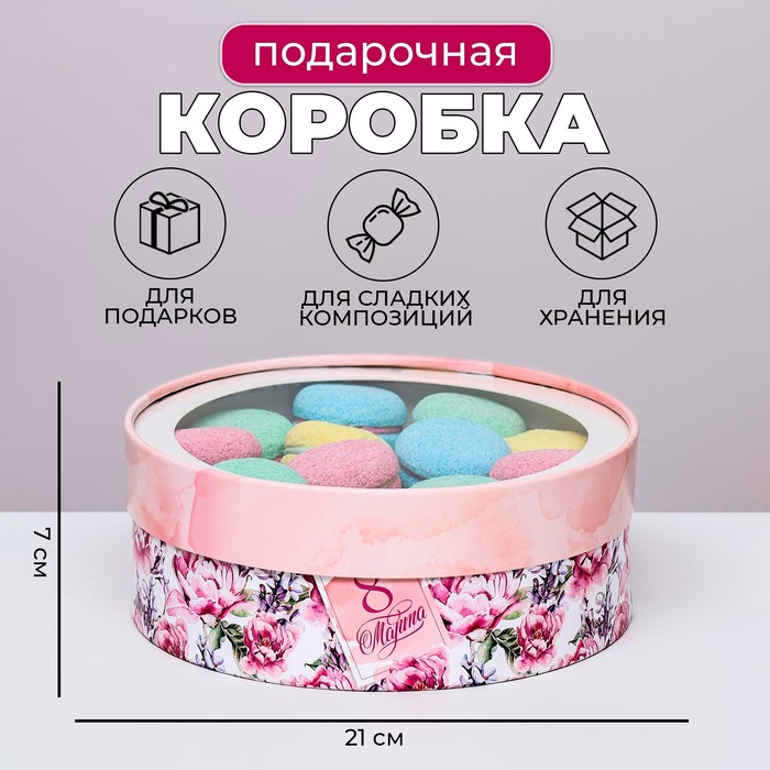 Коробка для макарун тубус с окном " 8 Марта " 21 х 21 х 7 см