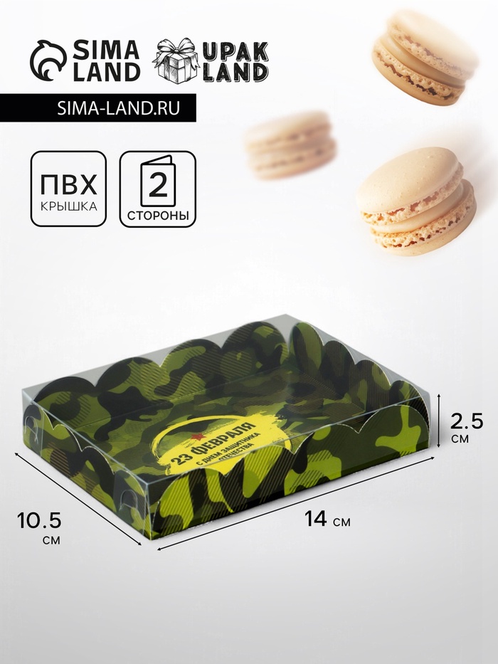 Коробка для печенья, кондитерская упаковка с пластиковой крышкой, «23 февраля», 10.5 х 21 х 3 см