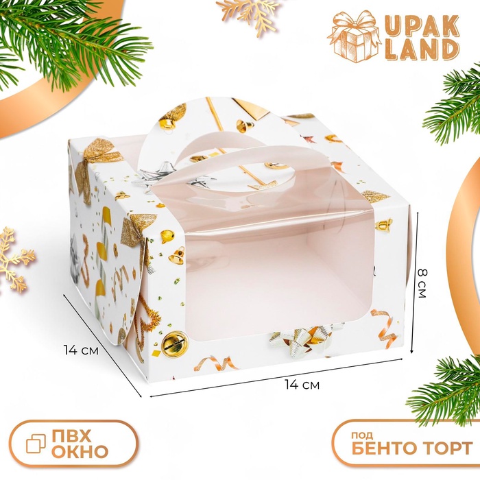 Коробка под бенто - торт с окном «Новогодняя с шишками», 14×14×8 см, Новый год