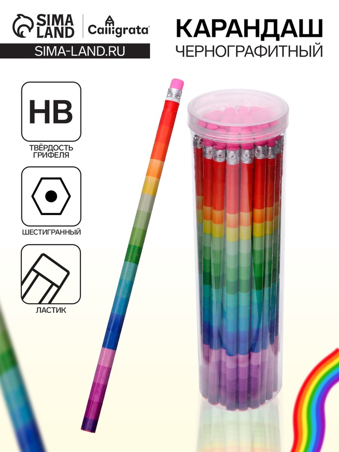 Карандаш простой, чернографитный с ластиком «Радуга», твёрдость НВ