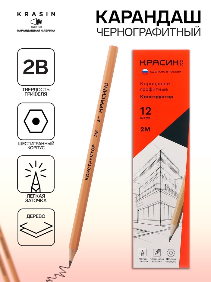 Карандаш чернографитный Красин «Конструктор», 2B, шестигранный, заточенный