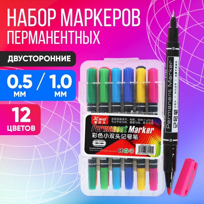Набор маркеров перманентных 12 цветов двусторонних 0,5 мм / 1,0 мм в пластиковом пенале