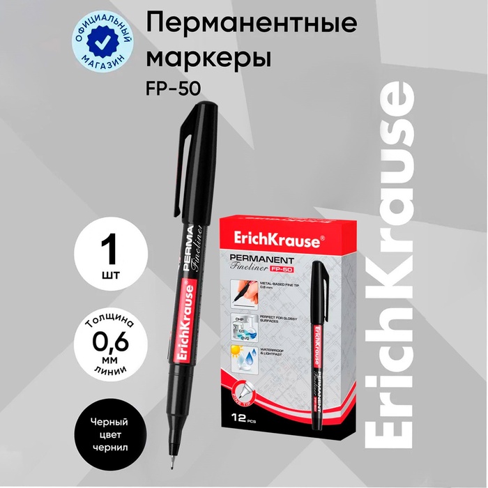 Маркер - лайнер перманентный ErichKrause FP-50, 0.6 мм, чернила на спиртовой основе, светостойкие и водостойкие, для любых поверхностей, чёрный