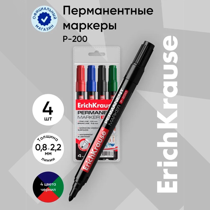 Набор маркеров перманентных 4 цвета, 0.8-2.2 мм, ErichKrause P-200, чернила на спиртовой основе, микс