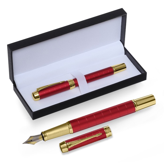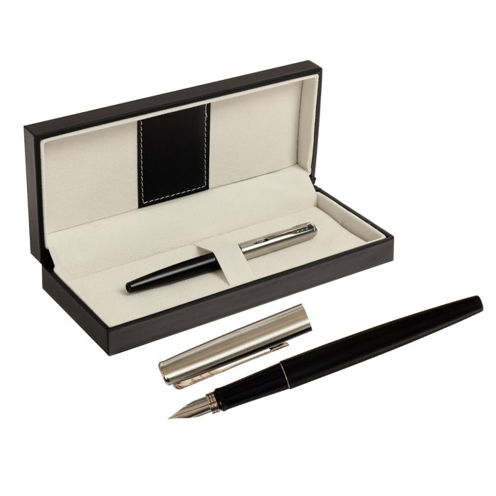 Ручка подарочная перьевая в кожзам футляре, корпус чёрный с серебром