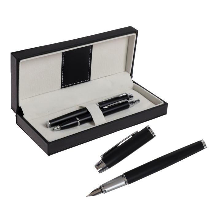 Ручки подарочные, 2 штуки, в кожзам футляре (перьевая и шариковая),ПБ IM, чёрная/серебро