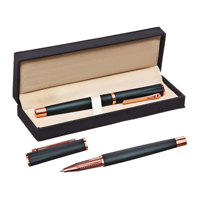 Ручка подарочная роллер в кожзам футляре Софтач корпус зеленый/медь
