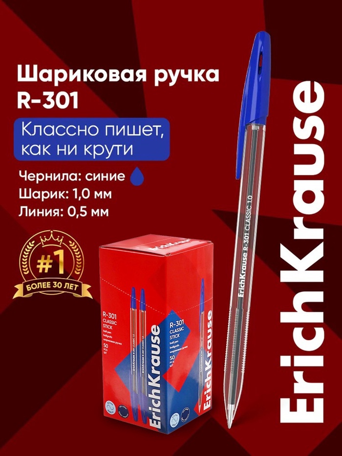 Ручка шариковая ErichKrause R-301 Classic Stick, узел 1.0 мм, чернила синие, длина линии письма 2000 метров, штрихкод на ручке