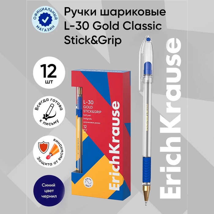 Ручка шариковая, ErichKrause L-30, Gold Stick&Grip Classic, игольчатый узел 0.7 мм, синяя, резиновый держатель, МИКС