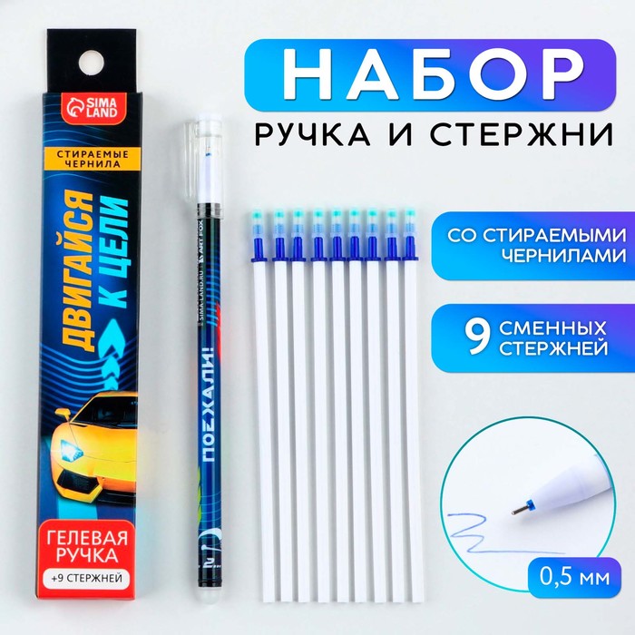 Ручка пиши стирай гелевая со стираемыми чернилами + 9шт стержней «Двигайся к цели», синяя паста, гелевая 0,5 мм