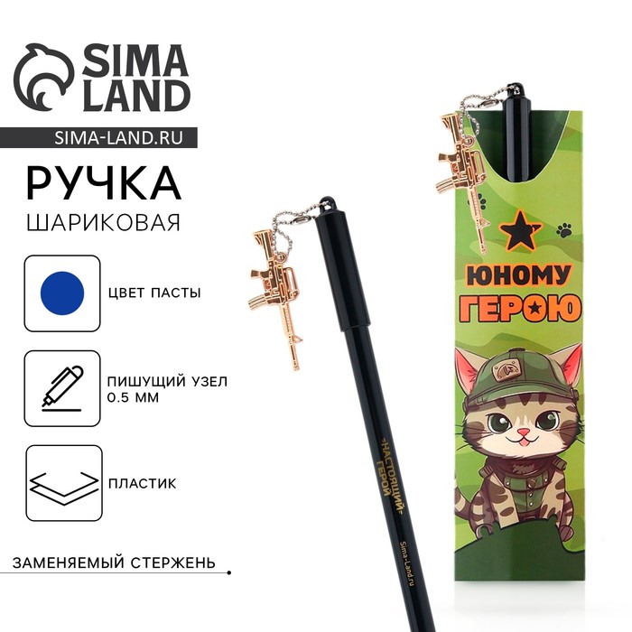 Ручка шариковая синяя паста 0.5 мм с подвеской автомат «Юному герою» пластик