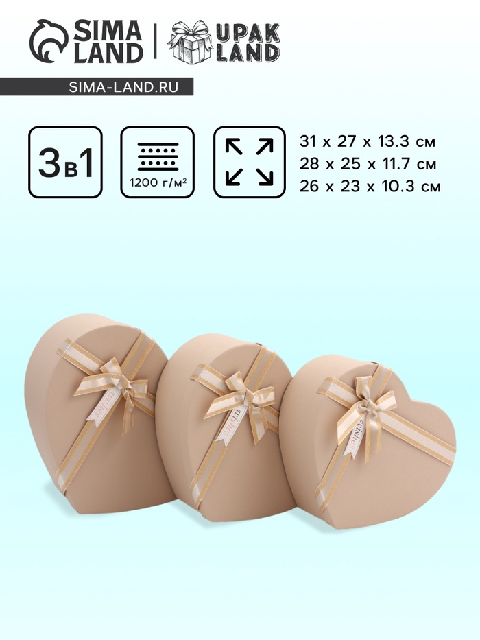 Набор подарочных коробок сердце 3 в 1, бежевый матовый, 31×27×13.3; 28×25×11.7; 26×23×10.3 см