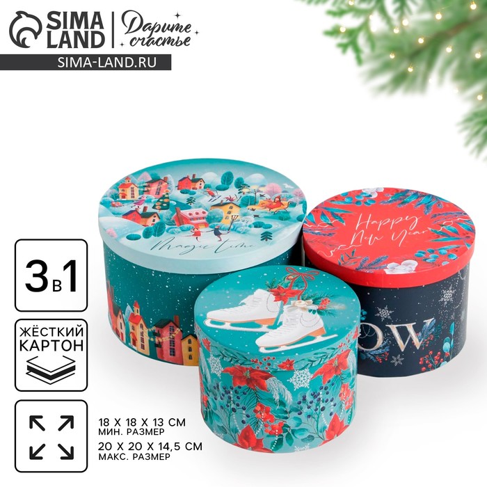 Набор коробок круглых 3 в 1 Magic time, 18 х 18 х 13 см, 20 х 20 х 14.5 см, 25 х 25 х 15 см, Новый год