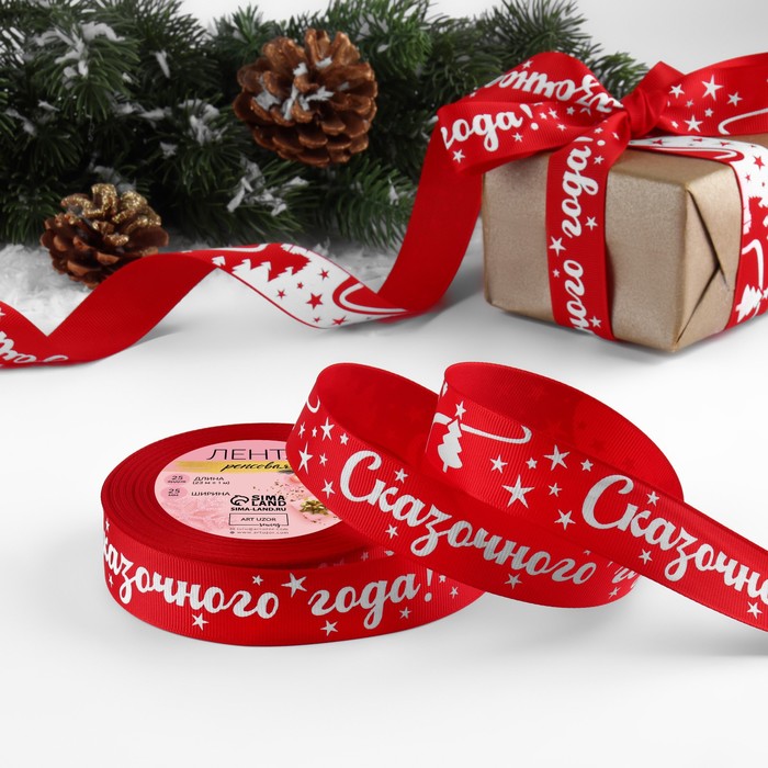 Лента репсовая «Сказочного года!», 25 мм, 23±1 м, красная, белая №026