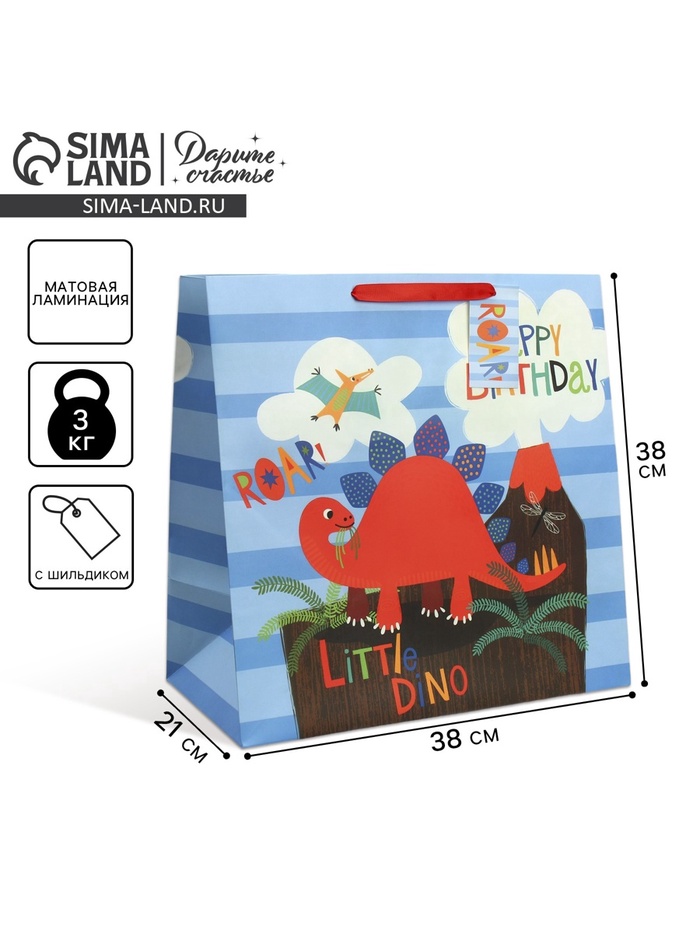 Пакет подарочный, упаковка, «Динозавр: С Днём рождения!», 38 х 38 х 21 см