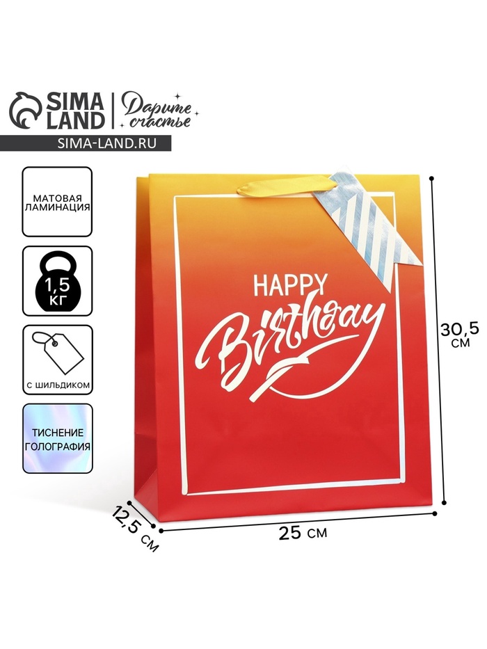 Пакет подарочный, упаковка, голография, Happy Birthday, 30.5 х 25 х 12.5 см
