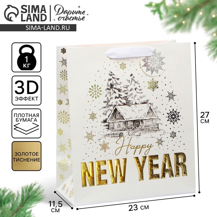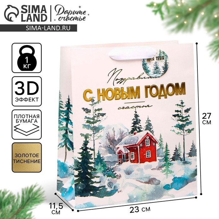 Пакет подарочный новогодний ламинированный, конгревное тиснение «Новогодний домик», ML 23 х 27 х 11.5 см
