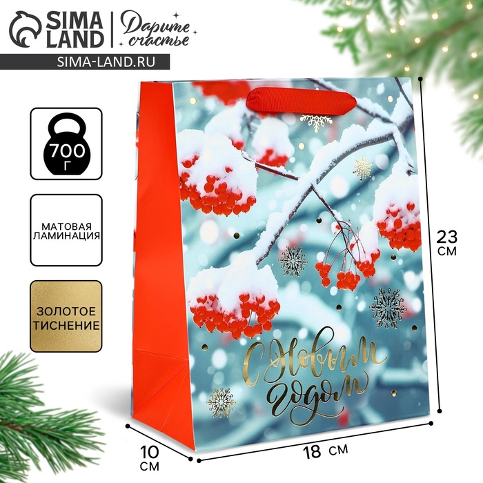 Пакет подарочный новогодний ламинированный «Рябина», MS 23 x 18 х 10 см