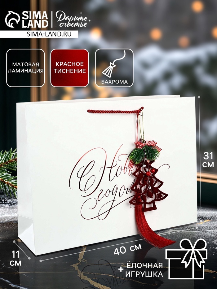 Пакет подарочный «Новогодний», тиснение, с ёлочной игрушкой и бахромой, 40×31×11 см