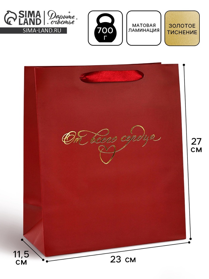 Пакет подарочный ламинированный, упаковка, «От всего сердца», ML 23 х 27 х 11.5 см