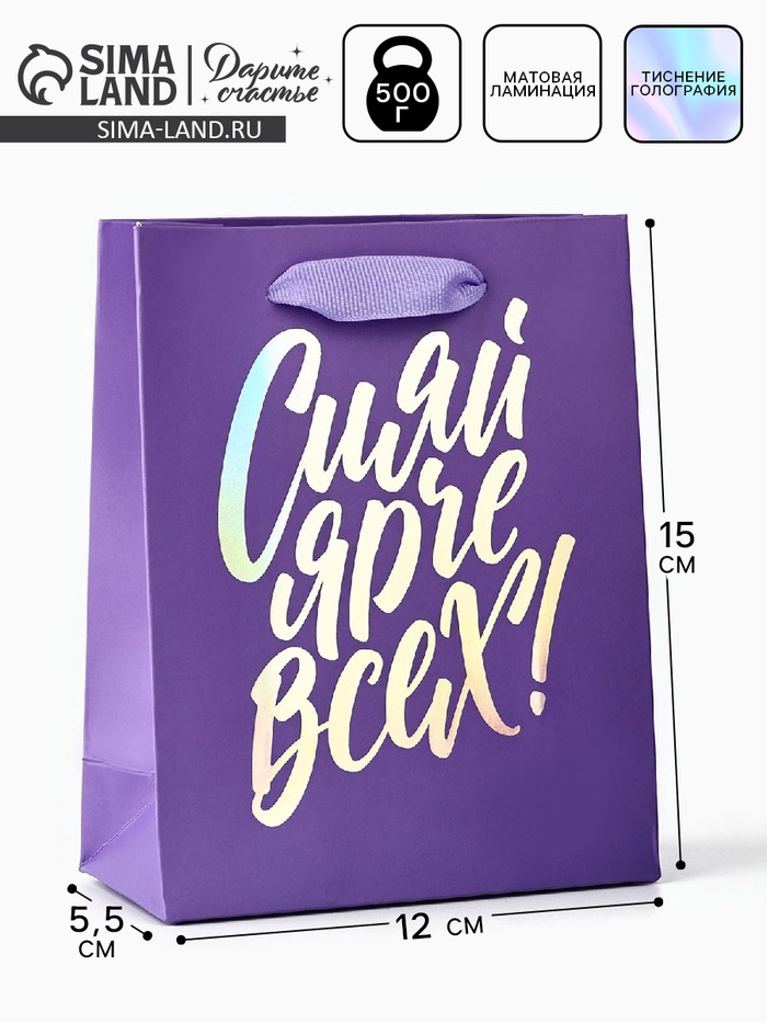 Пакет подарочный «Сияй ярче всех», голография, S 12 х 5.5 х 15 см