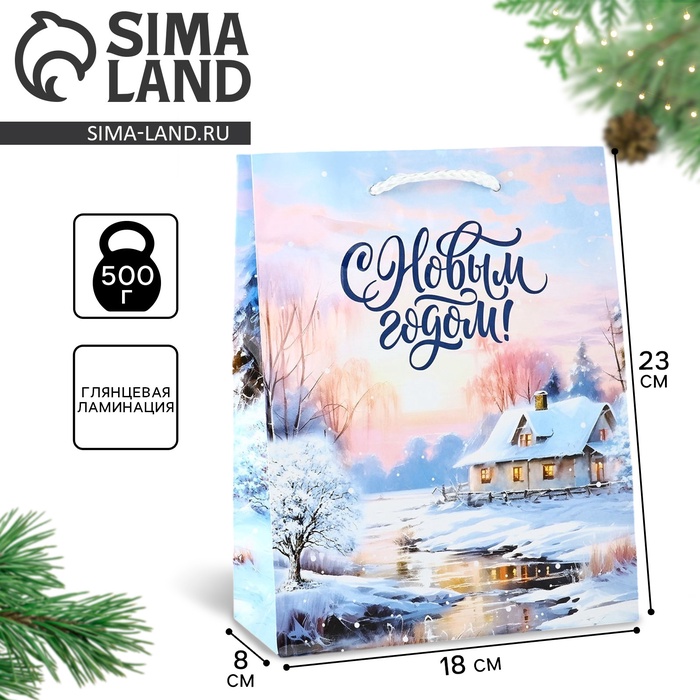Пакет подарочный новогодний ламинированный «Зимняя деревня», MS 18 х 23 х 8 см