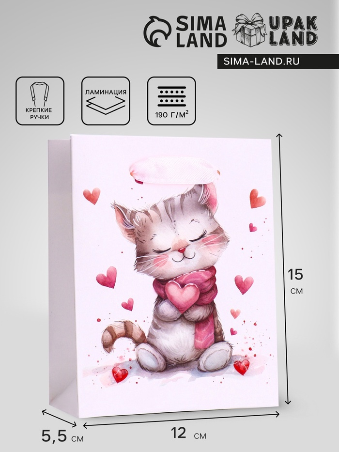 Пакет подарочный вертикальный «Сердечный котик», S 12×15×5.5 см
